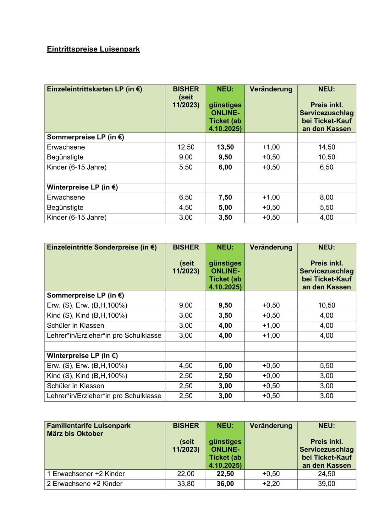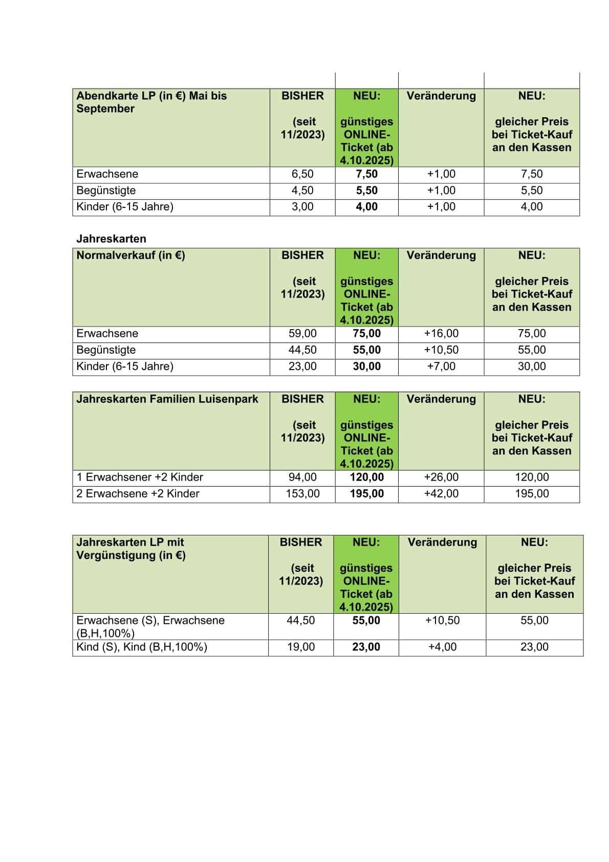 D.h. es ist für alle besser, je mehr Menschen online kaufen: Ziel ist, eben nicht mehr mit drei kleinen Kindern, wenn es heiß ist, ewig anstehen müssen.“ Die Familientageskarte in der Sommer-Saison für einen Erwachsenen und zwei Kinder zum Beispiel steigt um 2,50 Euro auf 24,50 Euro, die Jahreskarte für den Erwachsenen kostet 75,- Euro, die Jahreskarte für Kinder ab 6 (darunter freier Eintritt) kostet 30,- Euro.