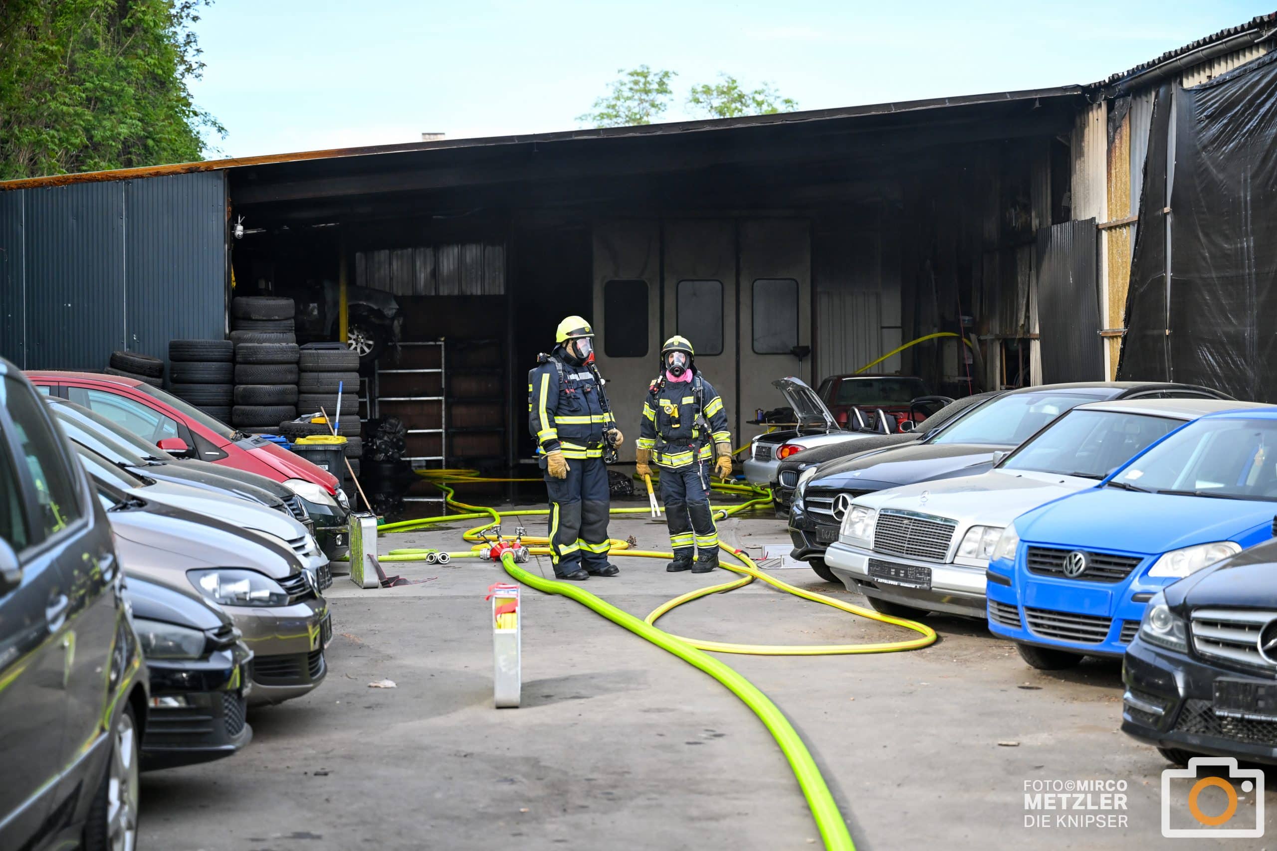 Ein brennender Pkw auf einer Hebebühne löst einen Großeinsatz in einer Autowerkstatt aus – die Feuerwehr kann eine Ausbreitung der Flammen verhindern. Fotos: Mirco Metzler/Die Knipser