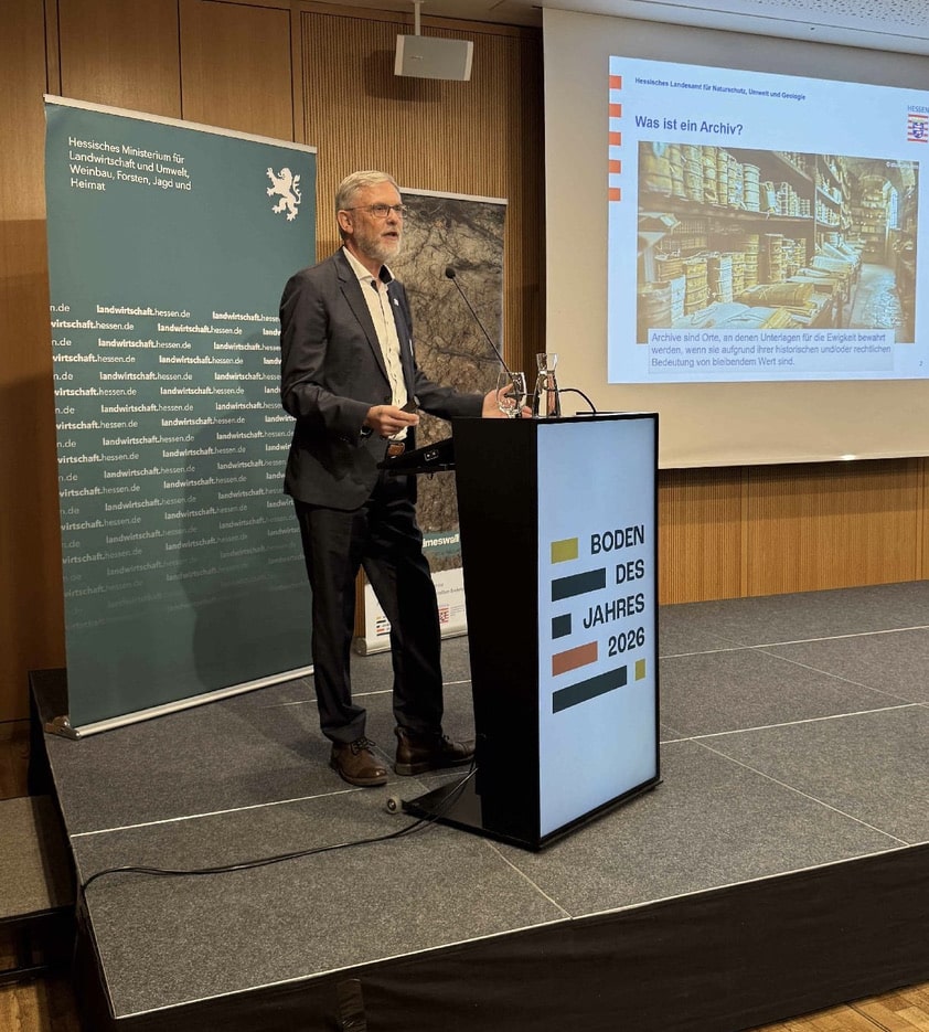 „Archivböden sind unsere wichtigsten Verbündeten, um mehr Aufmerksamkeit auf die Welt unter unseren Füßen zu lenken“, ergänzt Prof. Dr. Thomas Schmid, Präsident des HLNUG und Laudator bei der Festveranstaltung zum Weltbodentag in der Hessischen Landesvertretung in Berlin. „Sie liefern faszinierende Informationen über frühere Umwelt- und Lebensbedingungen und helfen uns, die Vergangenheit zu verstehen – und daraus für die Zukunft zu lernen. In Hessen gibt es viele dieser Böden, die Geschichten erzählen, und viele engagierte Mitstreitende, die sich für den Bodenschutz stark machen.“