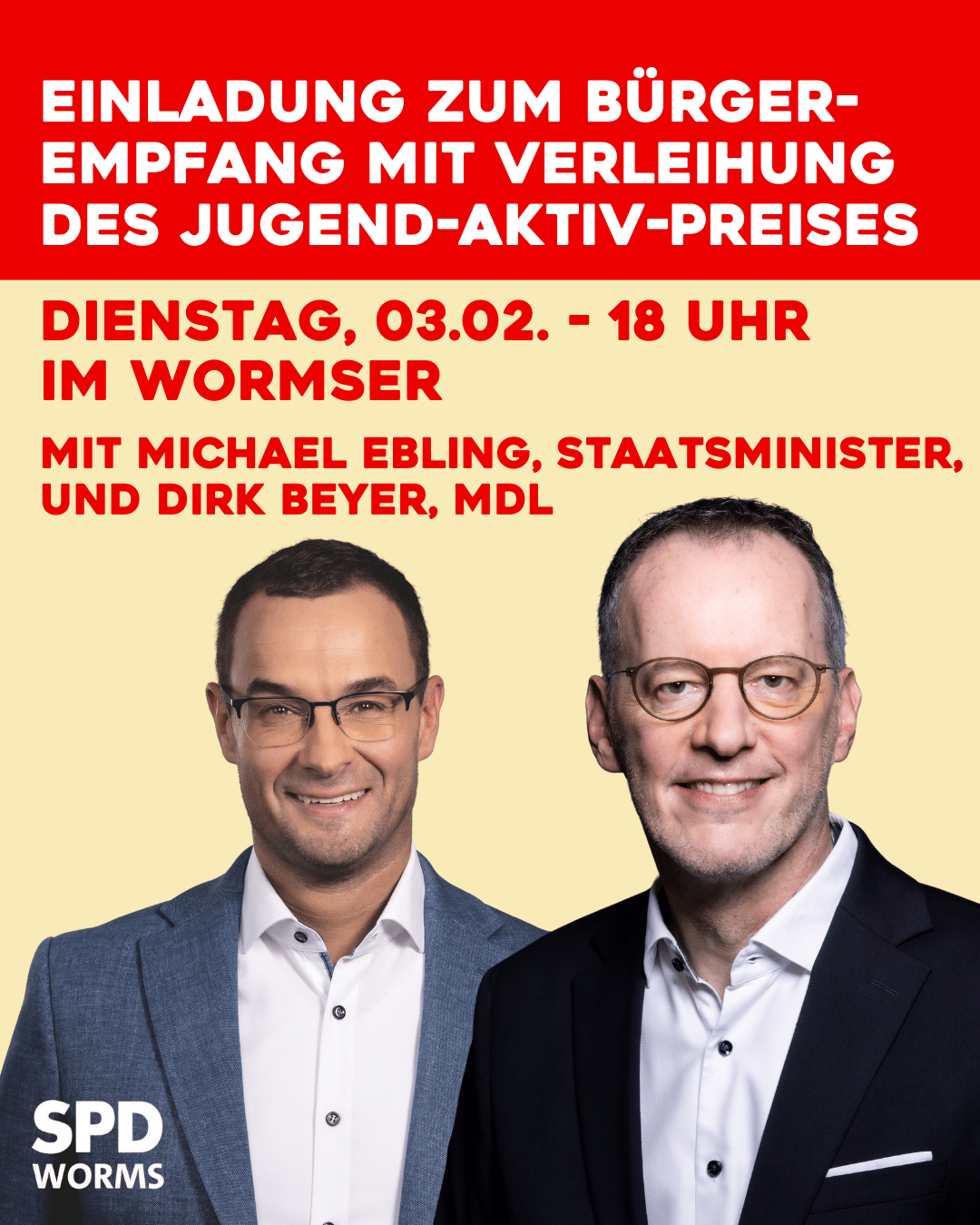 Ihr Engagement leistet einen wichtigen Beitrag für den gesellschaftlichen Zusammenhalt und die Sicherheit in der Stadt. Als Ehrengast wird Michael Ebling, Staatsminister am Bürgerempfang und der Ehrung teilnehmen. Begleitet wird er von Dirk Beyer, Landtagsabgeordneter, sowie den beiden Unterbezirksvorsitzenden der SPD Worms, Timo Horst und Maria Unterschütz.