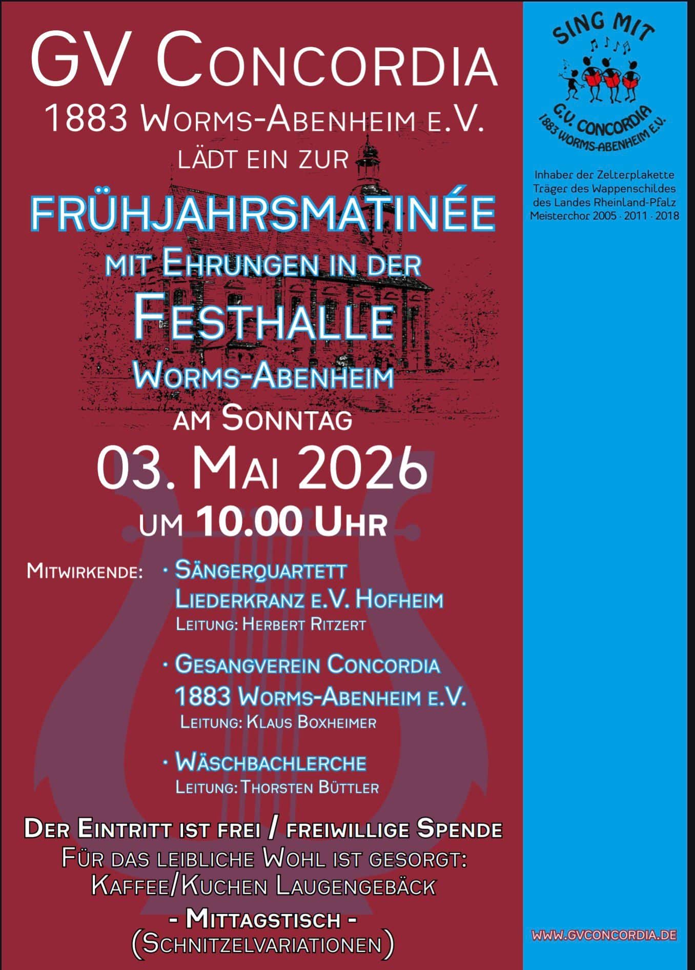 Der Gesangverein Concordia 1883 Worms-Abenheim e.V. lädt am Sonntag, 3. Mai 2026, zur traditionellen Frühjahrs-Matinée in die Festhalle Abenheim ein. Beginn der Veranstaltung in Worms-Abenheim ist um 10 Uhr. Im Mittelpunkt stehen Musik, Gemeinschaft und Ehrungen langjähriger Mitglieder.