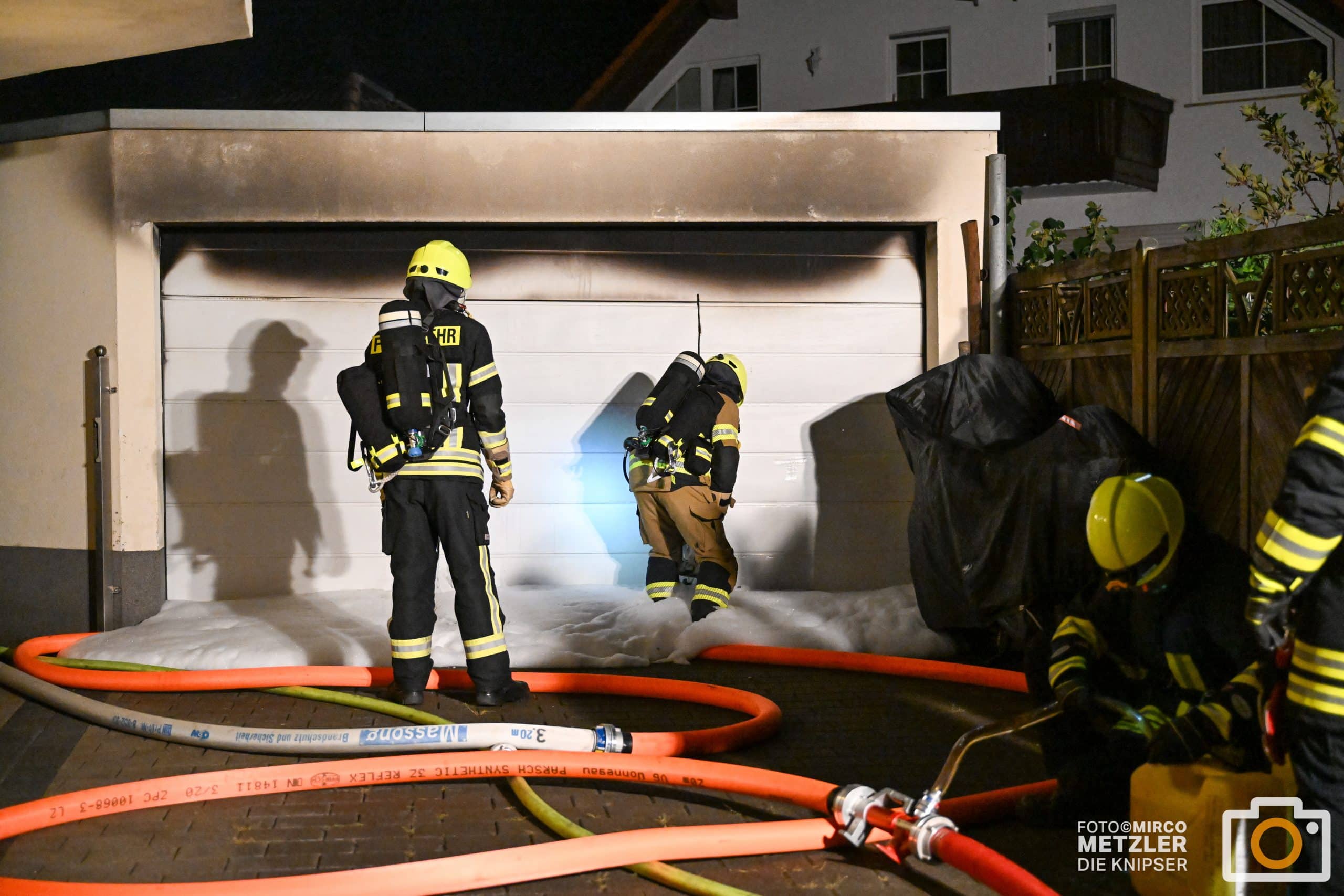Beim Eintreffen der Einsatzkräfte stand bereits ein Garagenkomplex in Flammen. Das Feuer griff auf eine angrenzende Terrasse über und beschädigte zudem die Fassade eines Wohnhauses. Glücklicherweise blieb das Wohngebäude weiterhin bewohnbar. Verletzt wurde niemand.