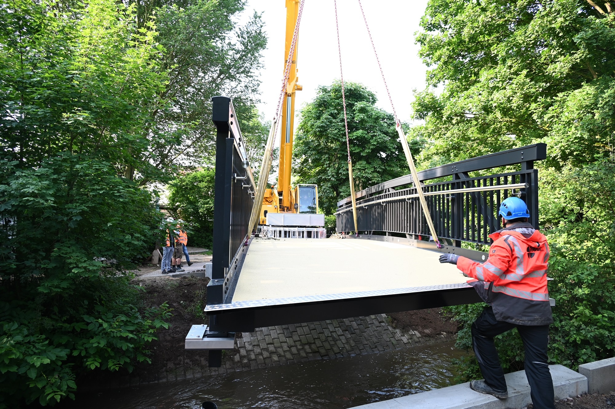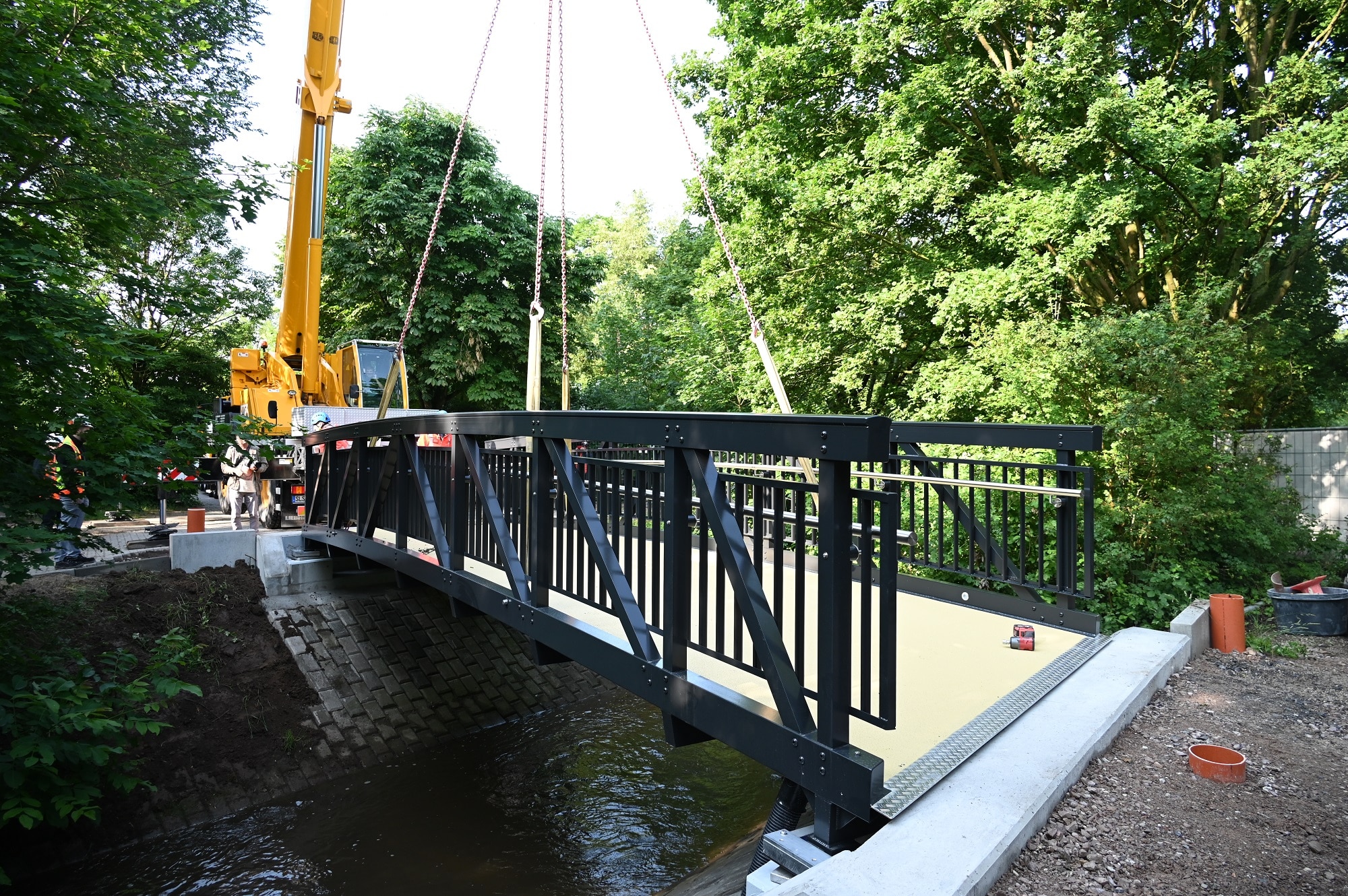 Die alte Brücke, die im April am Stück ausgehoben wurde, war aus Holz gefertigt, die neue besteht dagegen aus Aluminium und verspricht eine längere Haltbarkeit. Sie wurde komplett vorgefertigt angeliefert, so dass die Montage vor Ort in kurzer Zeit abgeschlossen werden konnte. Die neue Brücke mit dunkelgrau eloxierten Geländern hat einen rutschhemmenden