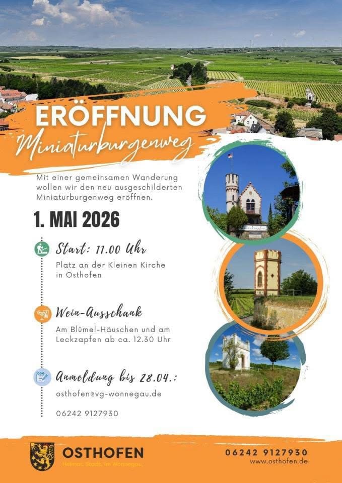 Osthofen erhält ein neues Ausflugsziel für Wander- und Weinfreunde: Am Donnerstag, 1. Mai 2026, wird der neu ausgeschilderte Miniaturburgenweg offiziell eröffnet. Zum Auftakt lädt die Stadt zu einer gemeinsamen Wanderung durch die rheinhessische Landschaft ein.