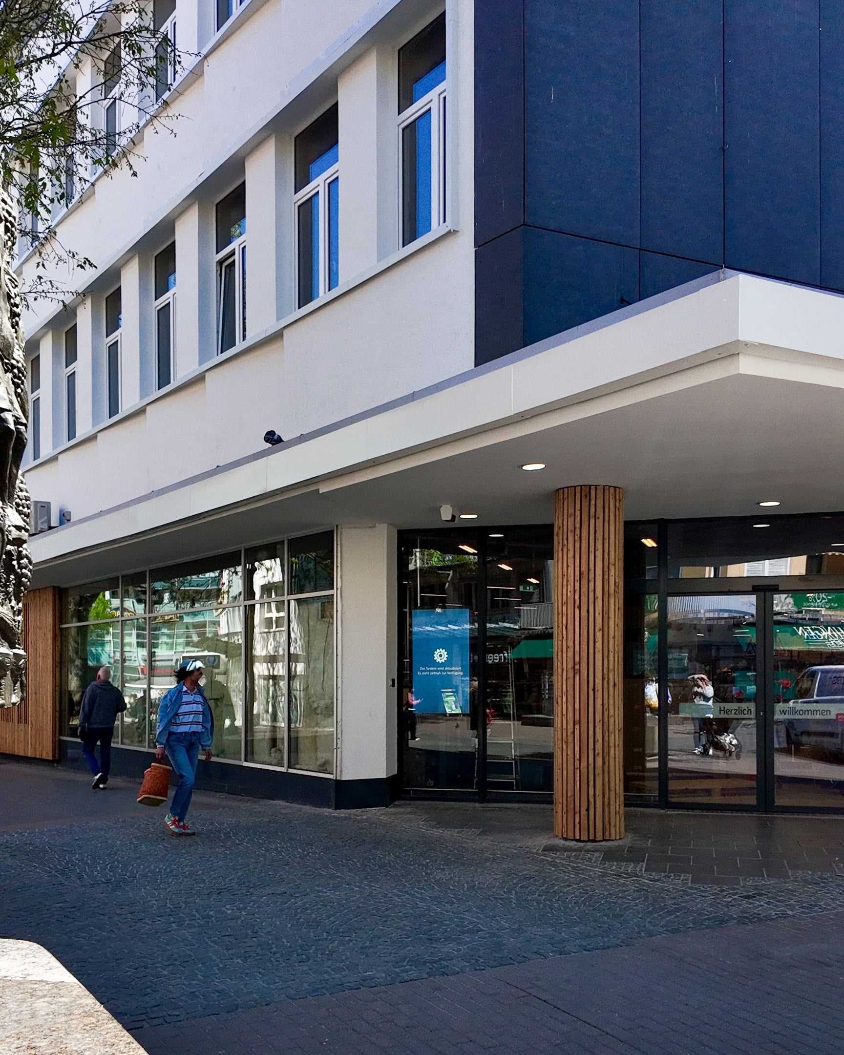 Schon jetzt ist der Fortschritt im Inneren deutlich sichtbar. Durch die großen Glasfronten lassen sich bereits gefüllte Regale erkennen, während auf der Verkaufsfläche noch letzte Arbeiten laufen. Auch an der Fassade sind die Vorbereitungen weit fortgeschritten. Die Halterungen für den markanten Rewe Schriftzug sind montiert, das Logo selbst dürfte in Kürze folgen.