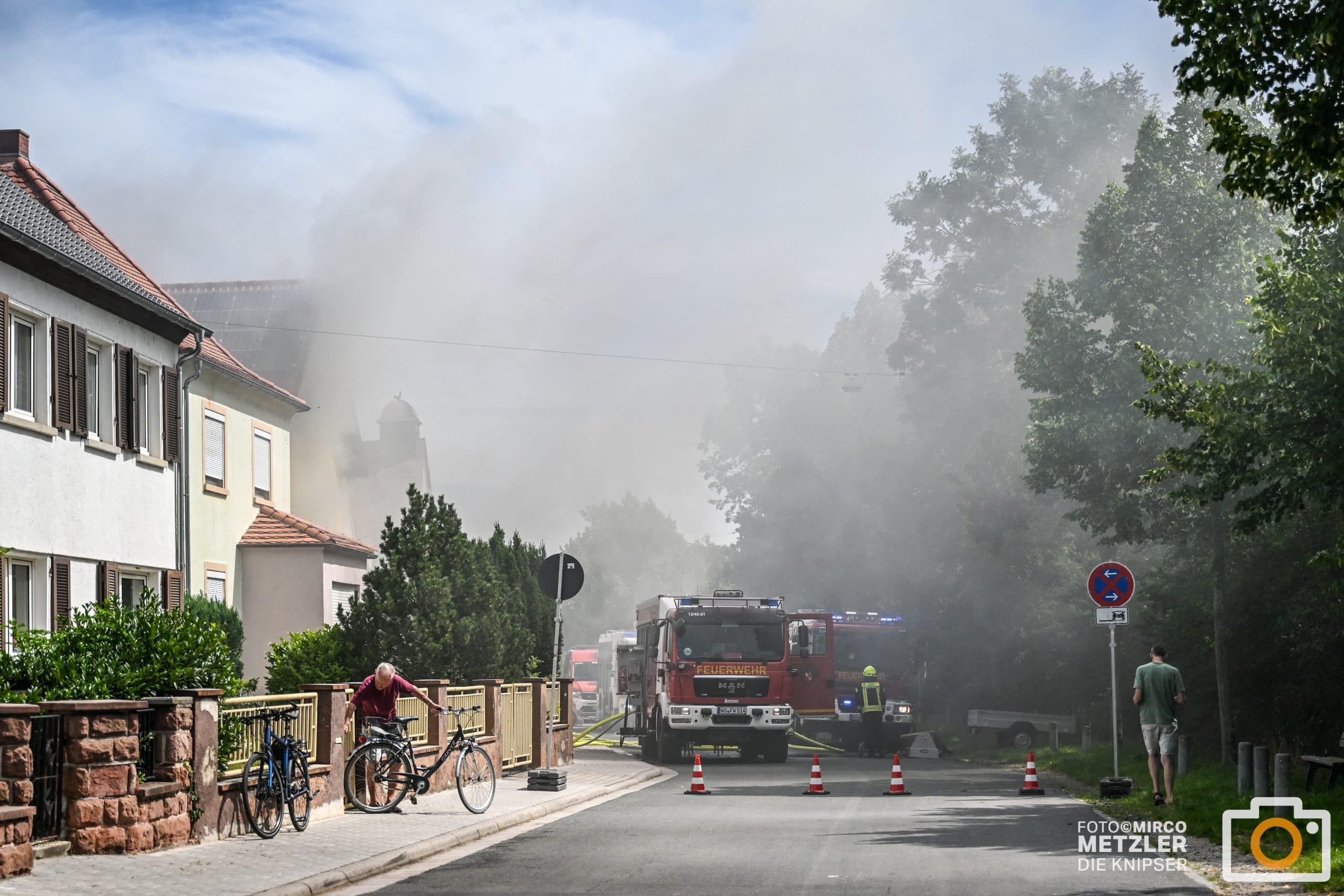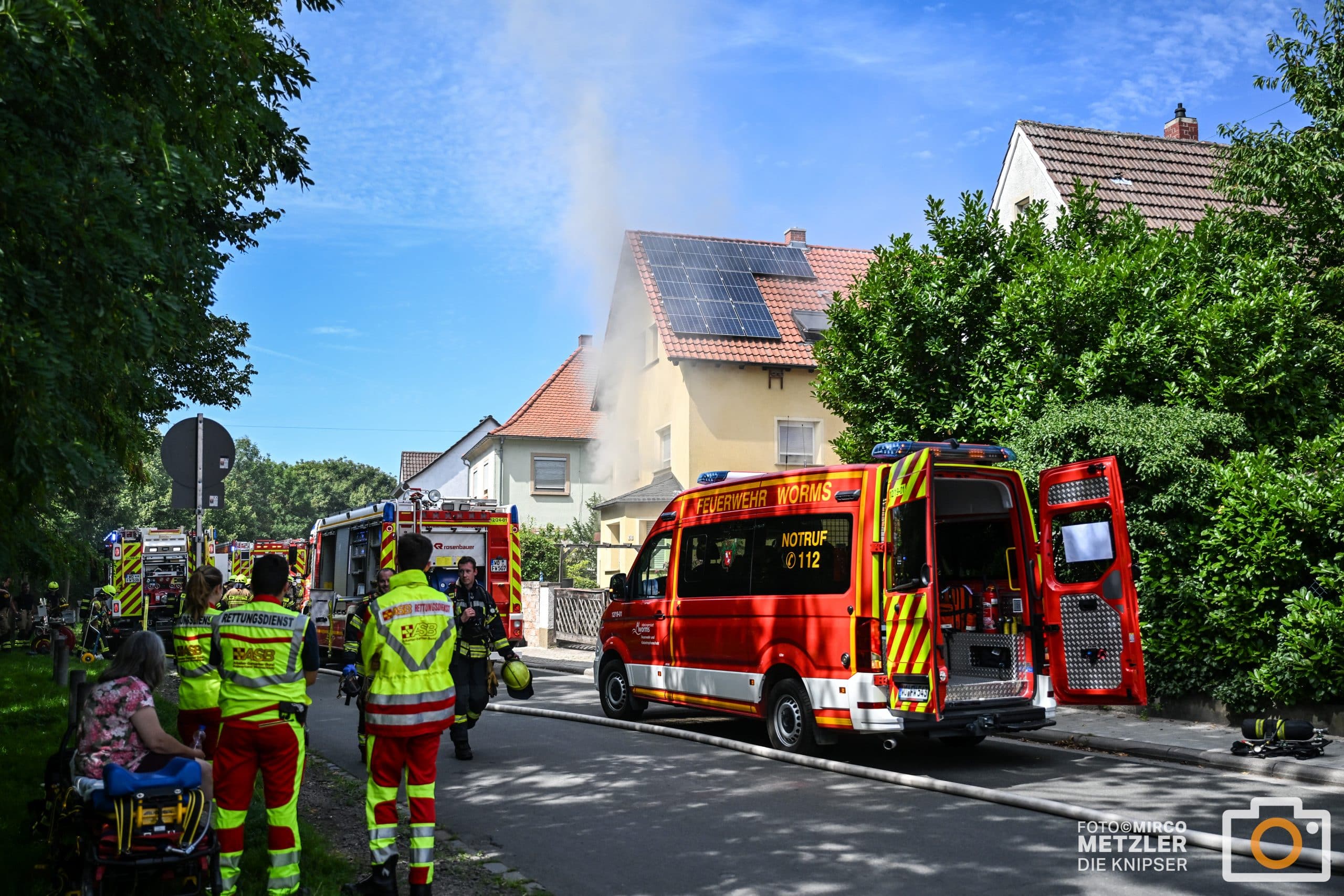 Großeinsatz in Worms-Pfeddersheim: Dichter Rauch dringt aus dem Keller eines Wohnhauses in der Grabenstraße. Ursache war ein brennender Lithium-Ionen-Akku einer PV-Anlage, der sich trotz massiver Löschmaßnahmen immer wieder entzündet. Fotos: Mirco Metzler/Die Knipser