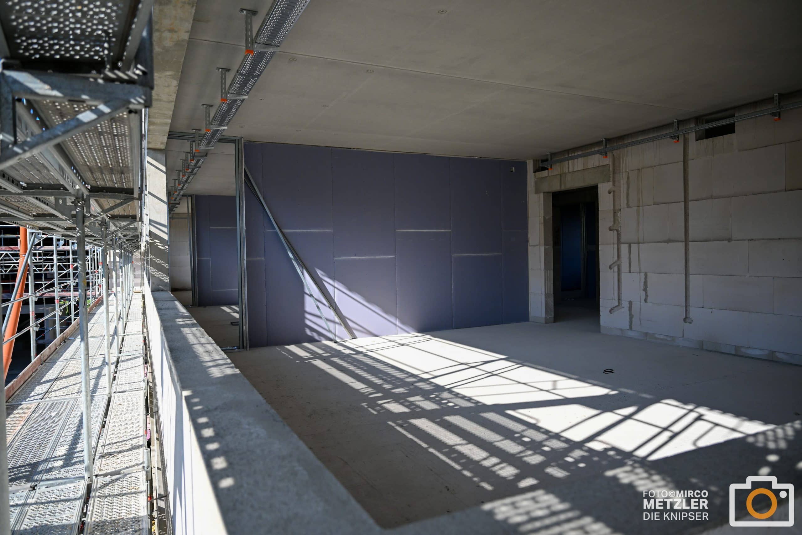 Projektleiter Matthias Iwanowitsch berichtete, dass die Arbeiten im Zeitplan liegen. Der Rohbau ist fertig, aktuell laufen Elektroinstallationen sowie die Vorbereitung für Heizung, Lüftung und Sanitär. Fenster und Fassadenelemente sind bereits in Produktion, die Sporthalle erhält in Kürze ihre Dachhaut mit begrüntem Aufbau. Ziel ist es, das Gebäude winterfest zu machen und den Innenausbau konsequent voranzutreiben.