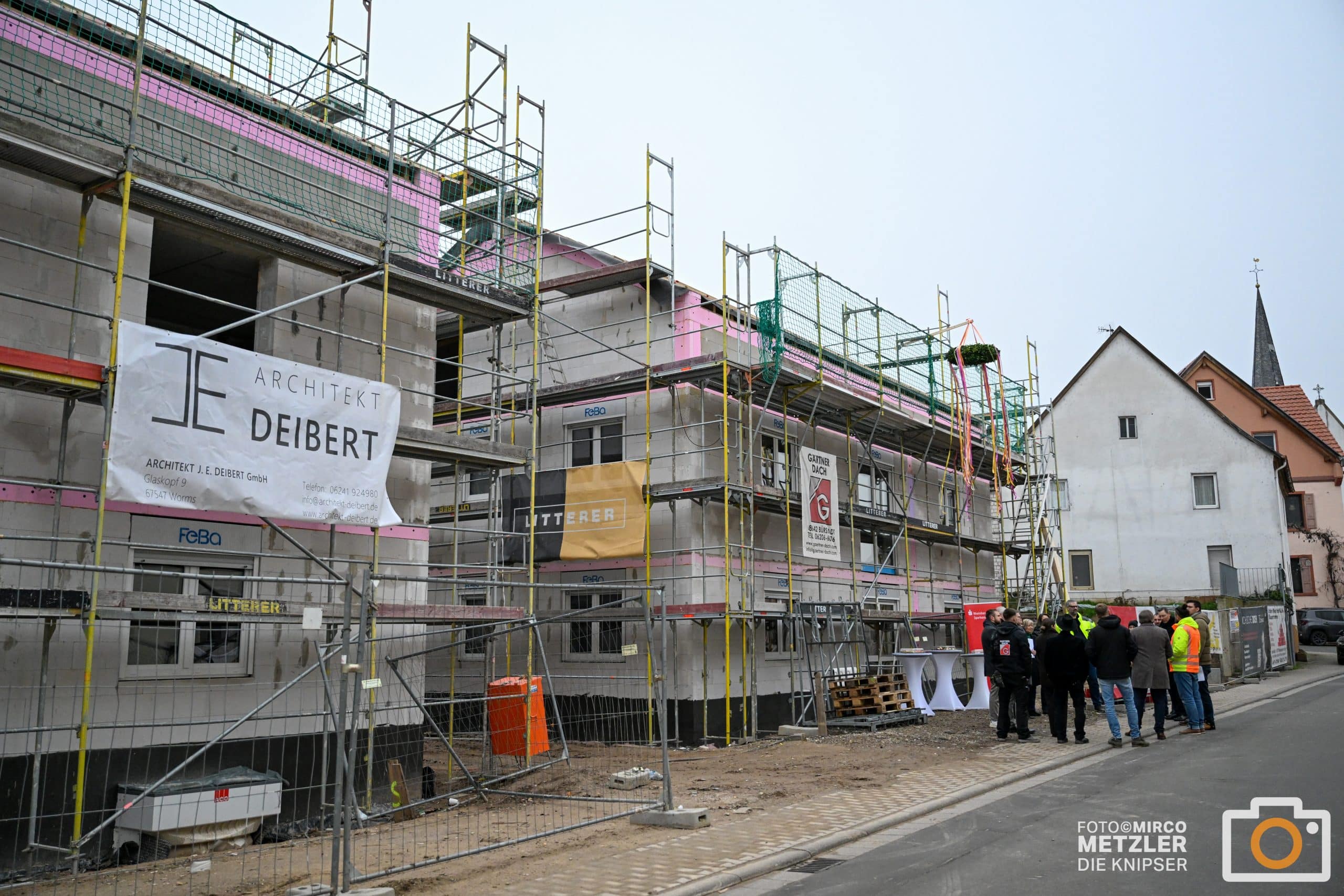 Auf dem ehemaligen Sparkassengelände in Monsheim wurde Richtfest gefeiert: Zwei Neubauten mit insgesamt 16 energieeffizienten Wohnungen entstehen hier – gefördert von Land und ISB und getragen von der Rheinhessen Sparkasse. Fotos: Mirco Metzler/Die Knipser