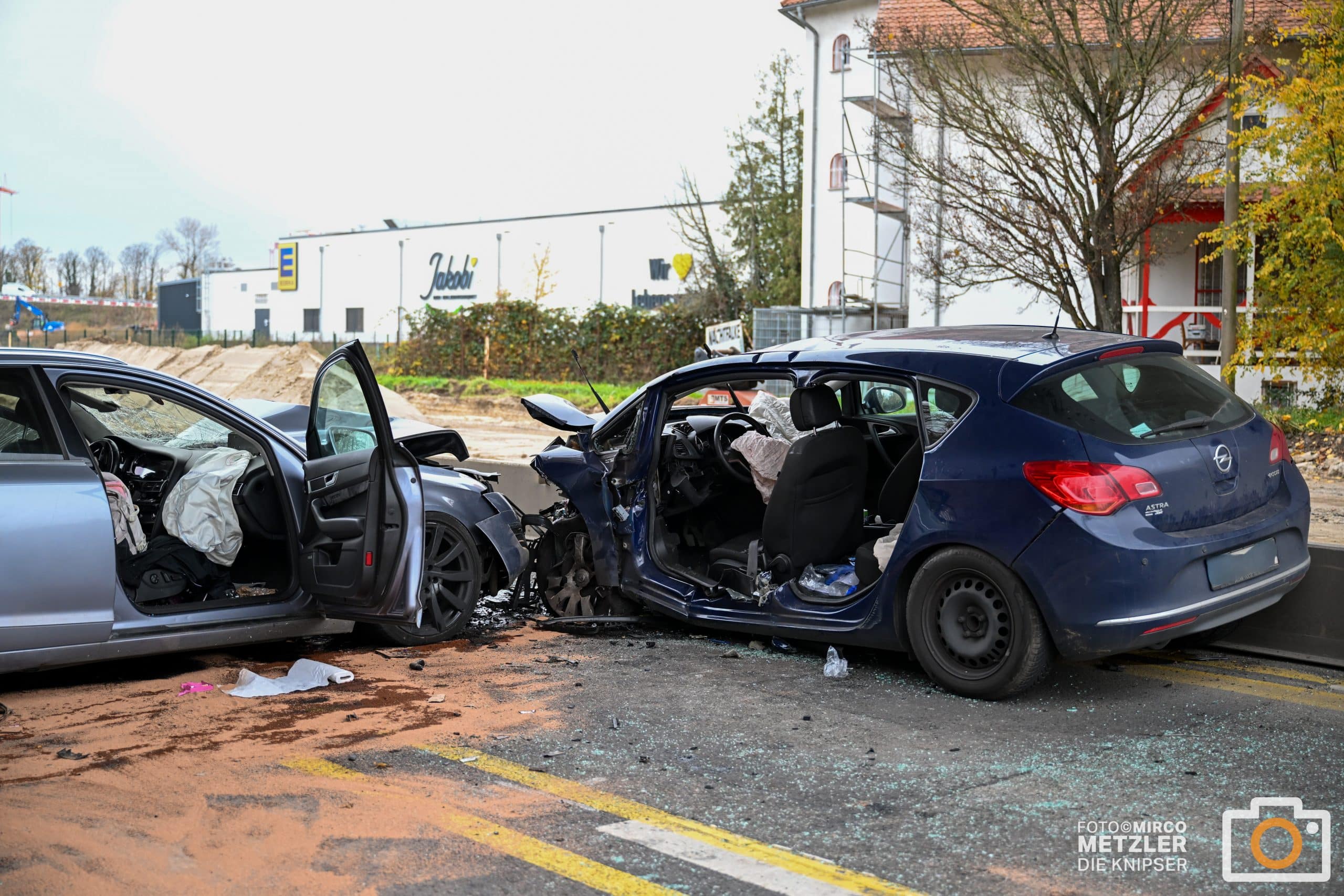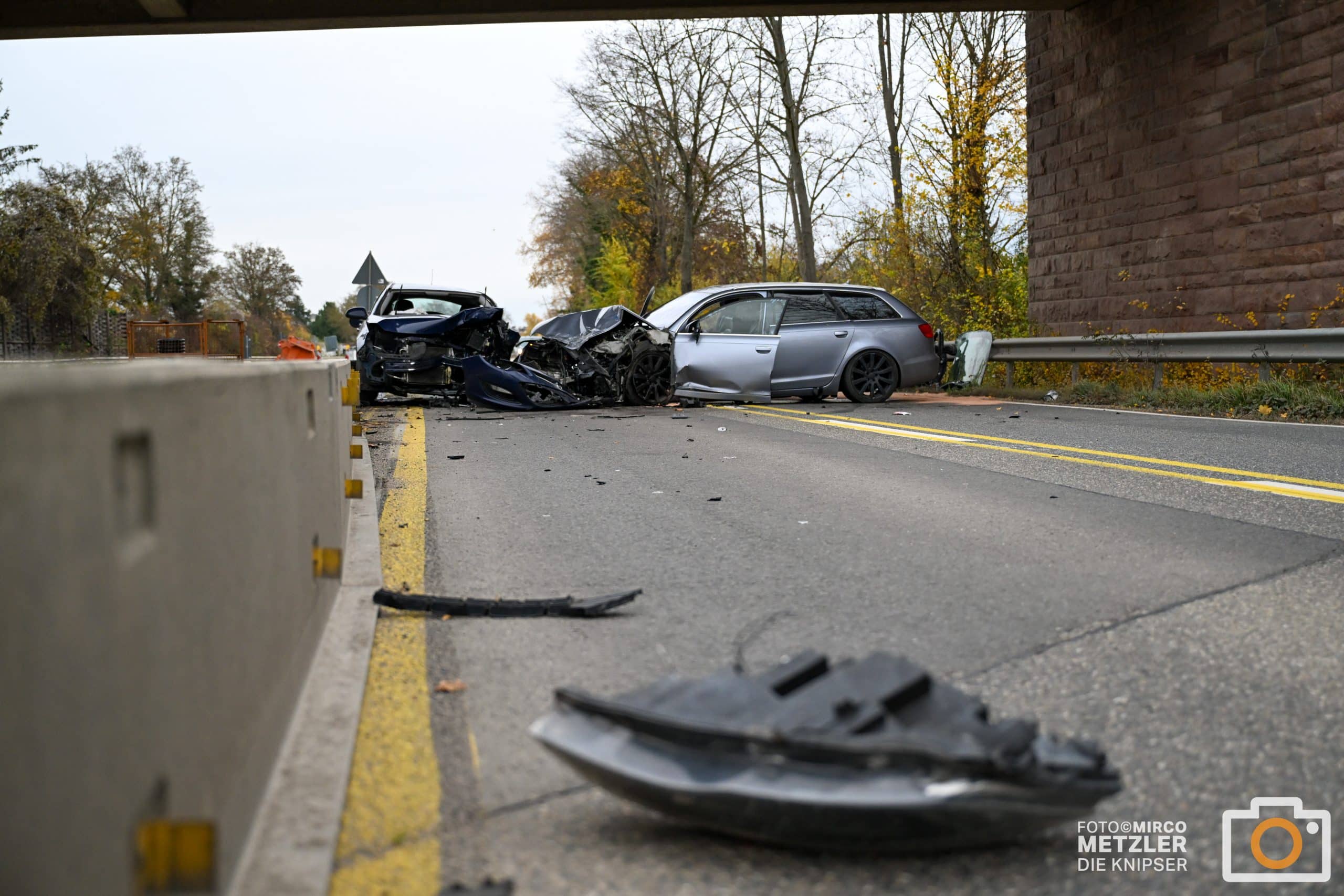 Frontalzusammenstoß auf der L523 bei Worms: Zwei junge Frauen und ein 6-jähriger Junge wurden bei dem Unfall schwer verletzt. Ein Kind erlitt leichte Verletzungen. Die L523 war stundenlang gesperrt, die Unfallursache wird derzeit untersucht. Fotos: Mirco Metzler/Die Knipser