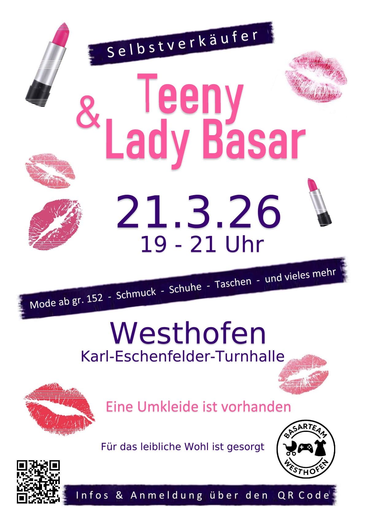 Am Samstag, 21. März 2026, lädt das Basarteam Westhofen zum Teeny & Lady Basar in die Karl-Eschenfelder-Turnhalle in Westhofen ein. Die Veranstaltung findet von 19 bis 21 Uhr statt und richtet sich an Jugendliche und Frauen, die auf der Suche nach Mode, Accessoires und besonderen Schnäppchen sind.