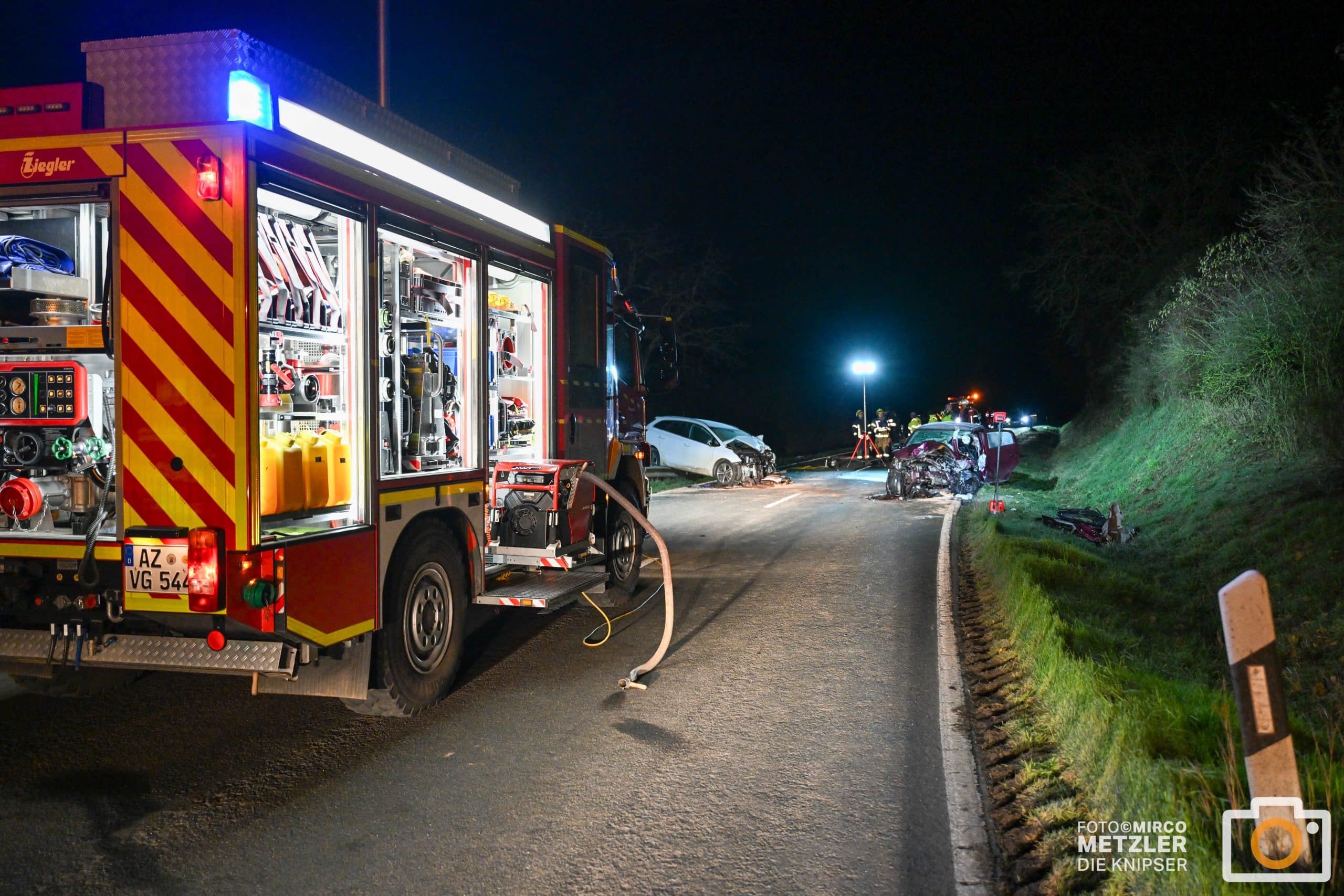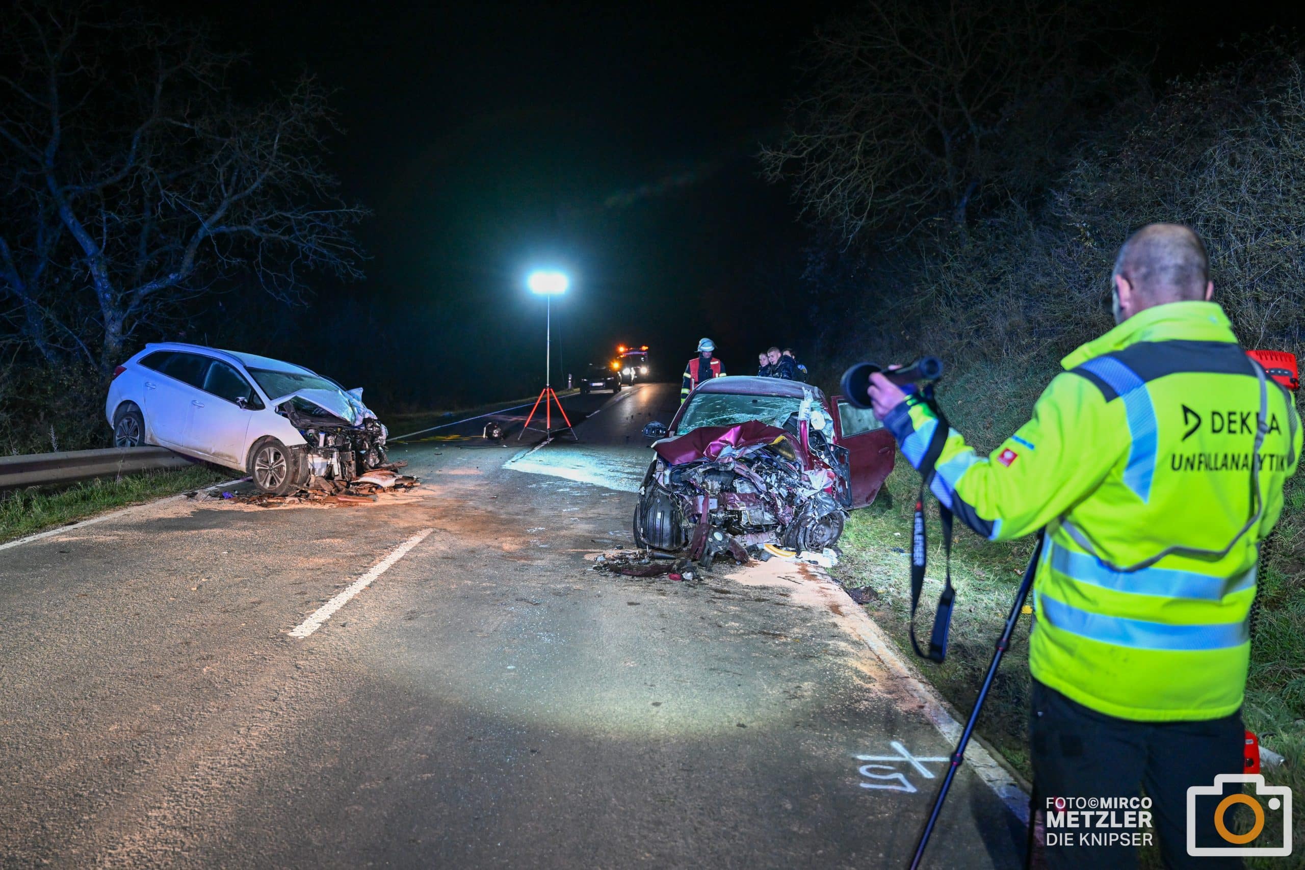 Tödlicher Unfall bei Flomborn: Eine 27-jährige Fahrerin verlor am Dienstagabend auf der B271 ihr Leben, nachdem sie frontal mit einem entgegenkommenden Pkw kollidierte. Ein Gutachter wurde mit der Unfallanalyse beauftragt. Fotos: Mirco Metzler/Die Knipser