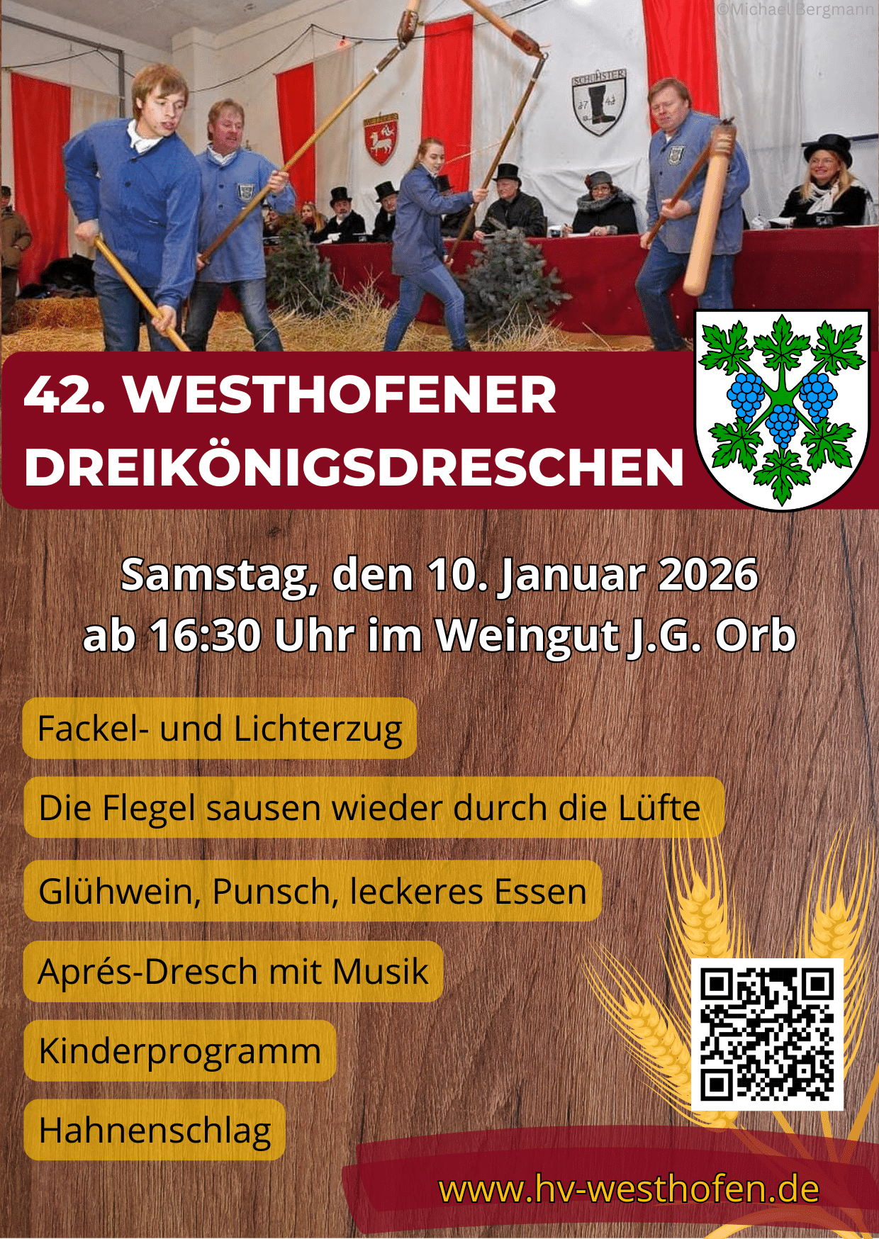 Westhofen. Wenn sich Fackellicht, fliegende Flegel und fröhliche Musik vereinen, dann ist es wieder so weit: Am Samstag, den 10. Januar 2026, lädt der Heimatverein Westhofen zum 42. Westhofener Dreikönigsdreschen ein. Ab 16:30 Uhr steht das Weingut J. G. Orb ganz im Zeichen gelebter Tradition, Gemeinschaft und winterlicher Geselligkeit.