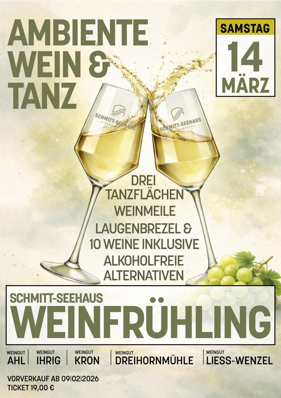 Wenn die Tage langsam länger werden und die Vorfreude auf den Frühling steigt, lädt das Schmitt-Seehaus am Samstag, den 14. März, zu einem besonderen Genusserlebnis ein: Beim „Weinfrühling“ treffen erlesene Tropfen auf stilvolles Ambiente und mitreißende Tanzmusik.