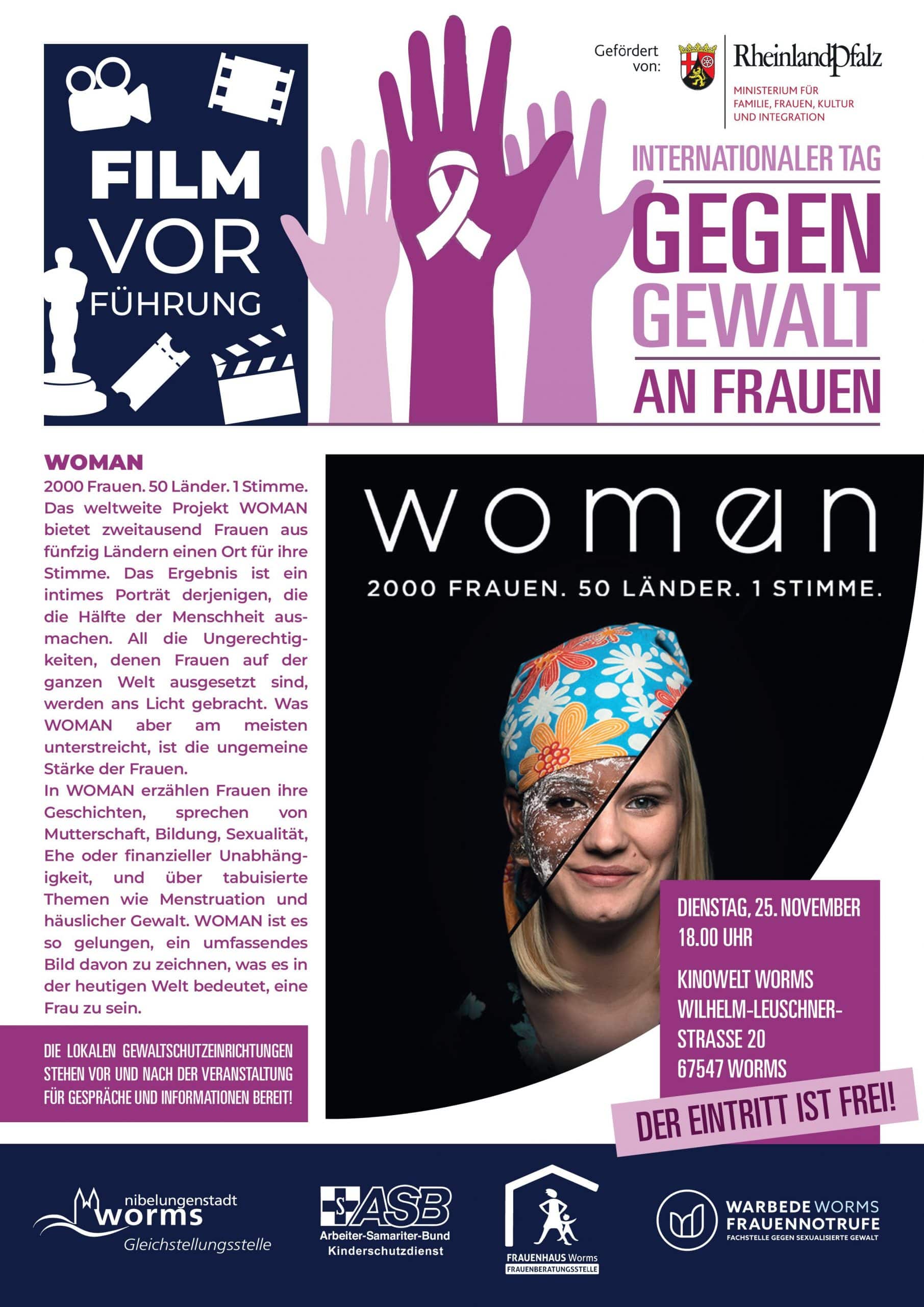 Anlässlich des Internationalen Tages gegen Gewalt an Frauen möchte ein Bündnis aus diesen Wormser Gewaltschutzeinrichtungen und der städtischen Gleichstellungsstelle daher Frauen aus aller Welt zu Wort kommen lassen und lädt dazu am Dienstag, 25. November, 18 Uhr, in die Arkaden Lichtspiele Worms ein. Gezeigt wird der Film „Woman“, in dem 2.000 Frauen aus 50 Ländern darüber berichten, was es bedeutet eine Frau zu sein.
